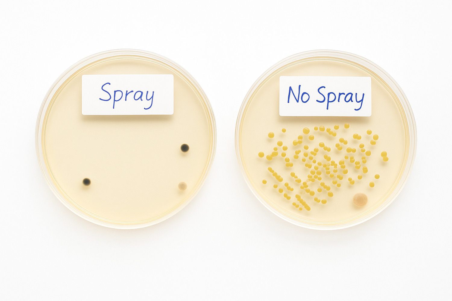 In deze test hebben we twee petrischalen vergeleken. De schaal ‘No Spray’ is zonder licht en zonder vloeistof gebruikt.